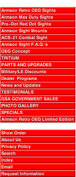 Armson OEG Red Dot Reflex sights have been the choice of military, law enforcement, and sporting users for over 45 years. Both eyes remain open for instant target acquisition, improved depth perception, and no loss of peripheral vision. The Armson Aiming Concept instantly merges the dot and target. A fiber optic light source provides illumination during the day and the optional Tritium upgrade self-powers the sight at night. No batteries required. Constructed of 6061-T6 aluminum with matte black anodized finish. Made in the U.S.A. with a limited lifetime warranty!